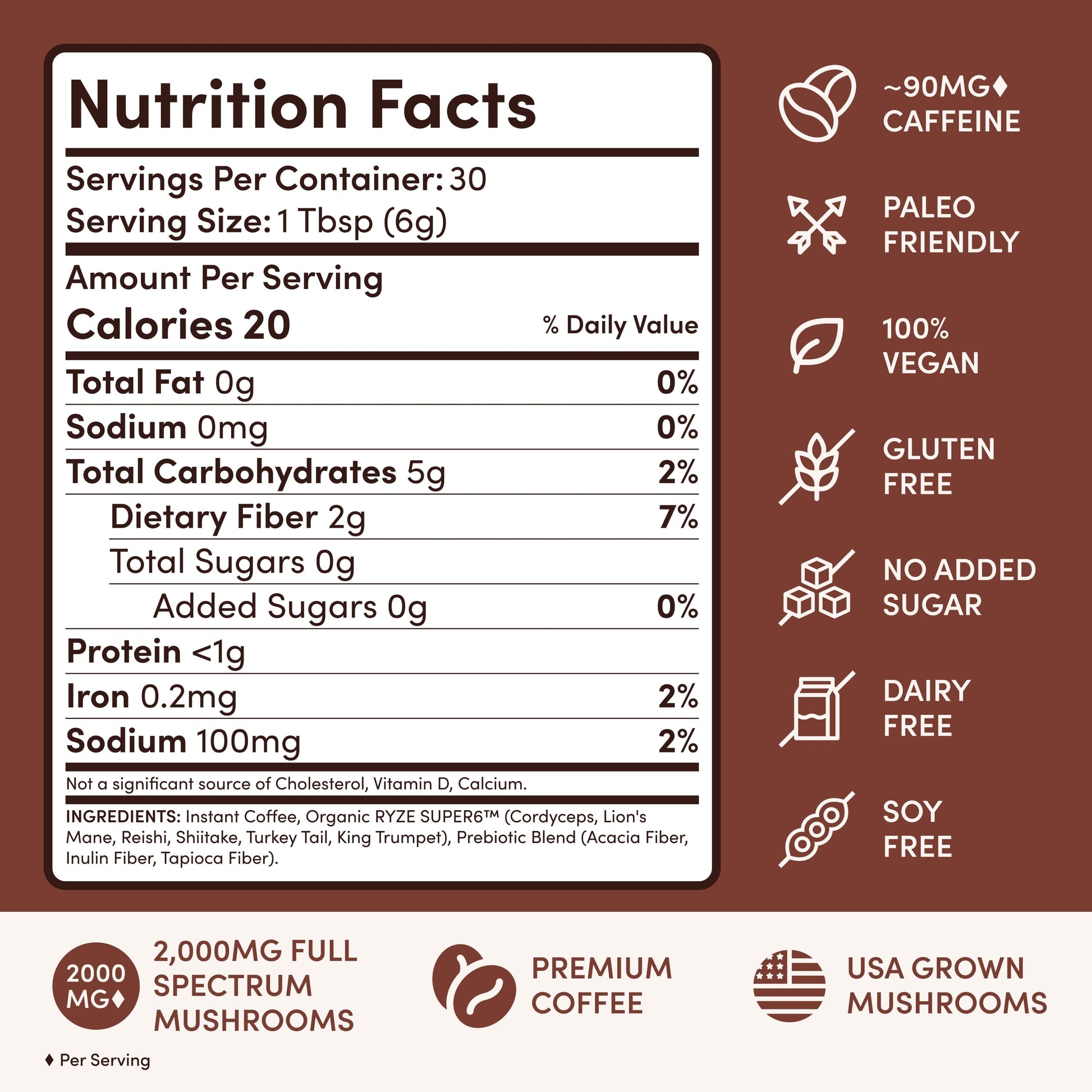 RYZE is a mushroom-powered coffee that helps boost energy, improve mental clarity, and support digestion. RYZE contains 6 Adaptogenic Mushrooms, MCT Oil and Instant Arabica Coffee, but only 48mg of caffeine per serving - to give you all the energy of regular coffee with none of the jitters or crashes. Every sip has a rich and creamy mouth-feel and is grounded in robust coffee-like flavor notes with just a hint of roasted hazelnut. RYZE is Certified USDA Organic, Gluten Free, Vegan, Non-GMO and contains 0 sugar. As a medium-roast Instant Coffee, preparation becomes easy. Just mix 1 tablespoon of RYZE with 8-10 ounces of hot or cold water, stir with your free acacia wooden spoon, add any creamer or sweetener you'd like and enjoy! Each bag is 30 servings (6.35oz) of goodness. RYZE and Shine!