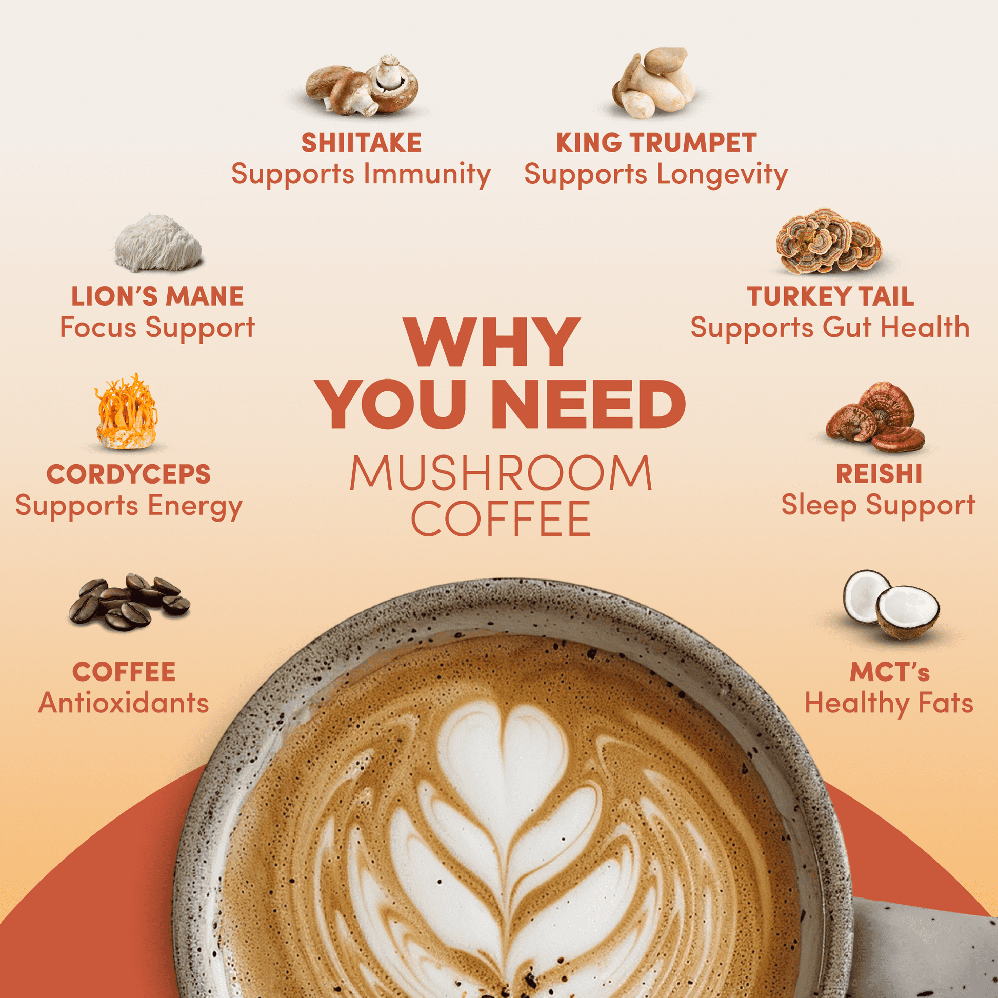 - HIGH POTENCY: Our signature blend features 2000mg per serving of superfood mushrooms: Cordyceps, Lion’s Mane, Reishi, Shiitake, Turkey Tail and King Trumpet. Plus healthy fat from MCT oil and Organic Arabica Coffee